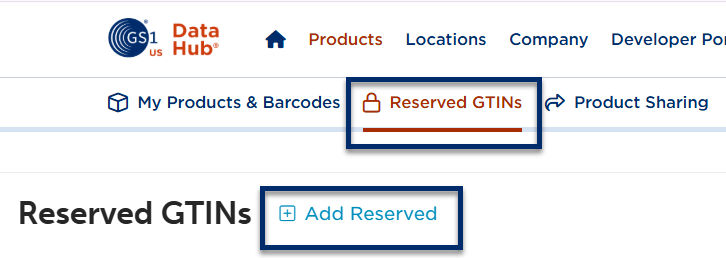 - Click Product, then Reserved GTINs. The Reserved GTINs page displays. Click Add Reserved.